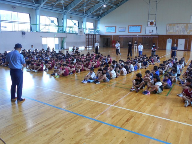 今年2回目の避難訓練は、不審者が侵入した想定での訓練です。十日町警察署の警察官から不審者になっていただき訓練を行いました。侵入予定のクラスには事前に顔合わを行い、過度な恐怖感や不安感を与えないようにしてから訓練をスタートしました。子どもたちは職員の指示や引率のもと体育館に集合しました。そして、しばらく静かな待機状態が続き、不審者確保で一連の訓練終了です。事後指導では、多くの子どもたちは様子が分からないので、不審者が侵入したクラスの様子を撮影した映像で確認しました。その後、警察官から、避難の際は「聞くこと」が大事であることと、屋外では「いかのおすし」が大事であることの指導を受けました。過度に不安をあおってはいけませんが、いざというときにしっかり行動できる心構えというのも難しいものです。ご家庭でも適切な声掛けと指導をお願いいたします。