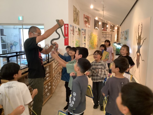 9月26日、2年生・生活「キョロロヘ出かけよう」 公開日 2025/09/26 更新日 2025/09/26 お知らせ 2年生がキョロロへ出かけ、カエルやヘビなど里山の生き物に触れたり、館内の展示物や展望台などを楽しんだりしてきました。ヘビには毒ヘビもいるので子どもたちには触らないように指導していますが、ここでは専門員から希望する子にはヘビを首にかけてもらうなどめったにない体験をしました。 +3