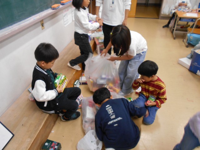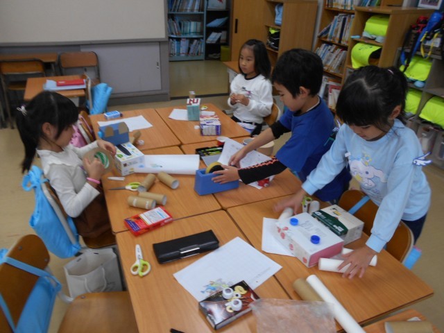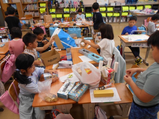 1年生が何やら楽しそうに教室で工作中です。いろいろな空き箱、お菓子の箱などを使って、楽しく作品作りです。箱の向きや組み合わせを考え、さあ、何が出来上がるかな?