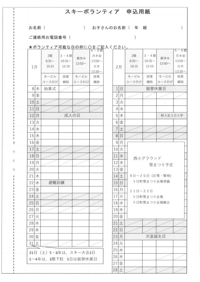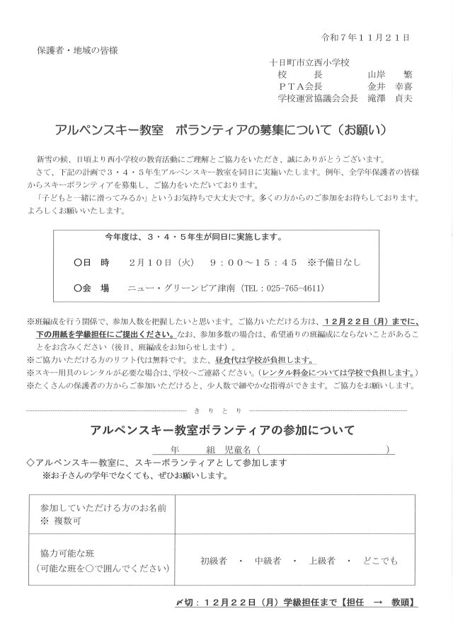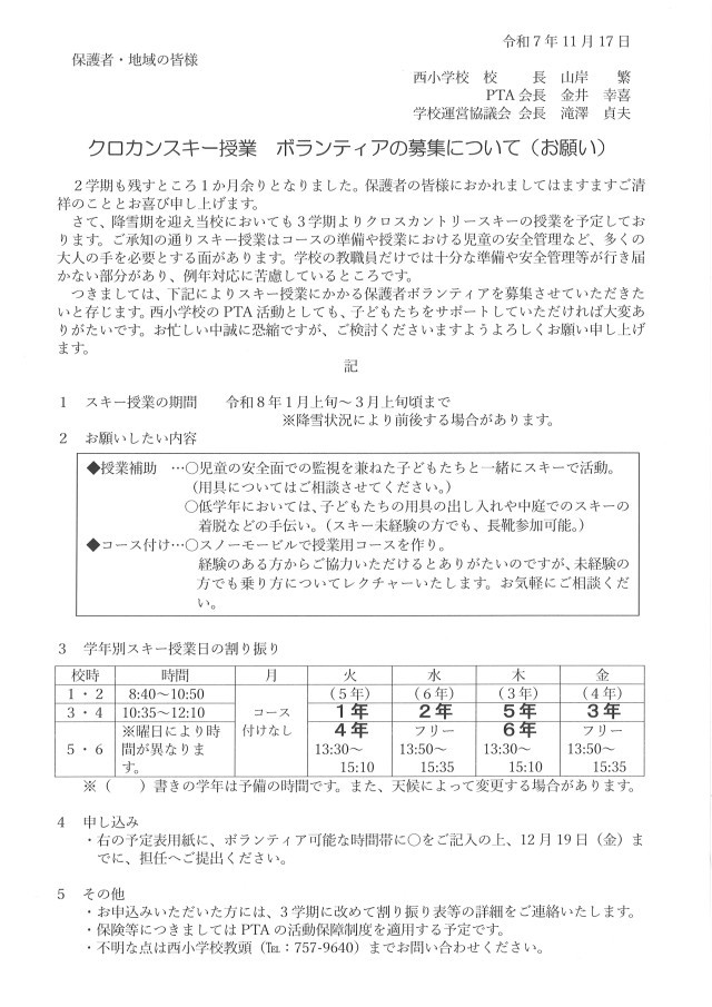 初雪の便りとともに、今年度もクロスカントリースキー授業とアルペンスキー教室のボランティアを募集します。子どもたちが楽しくスキーを学ぶために、保護者・地域の皆様、ご都合がつきましたら、ぜひご協力いただけると幸いです。