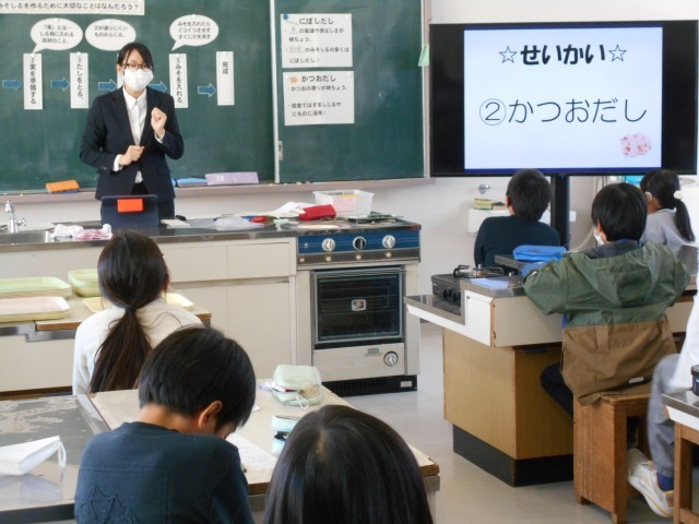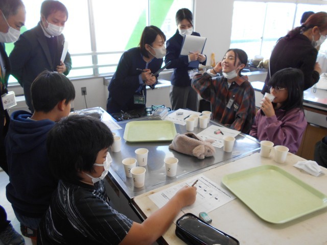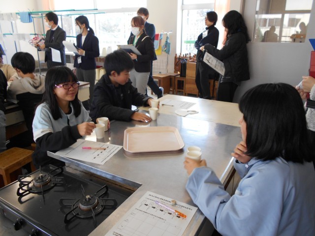 みなさん、①にぼし出汁、②かつお出汁、③かつおとこんぶの合わせ出汁、④出汁無しの4種類の味噌汁を飲み比べて当てることができるでしょうか。今日の家庭科は、おいしい味噌汁を作るための作り方、出汁の大切さを味わう学習ですが、子どもたちも楽しそうでした。振り返りでは、家に帰ったら味噌汁を作ってみたいという子どもたちが多かったようです。