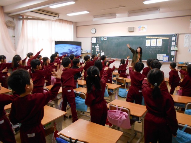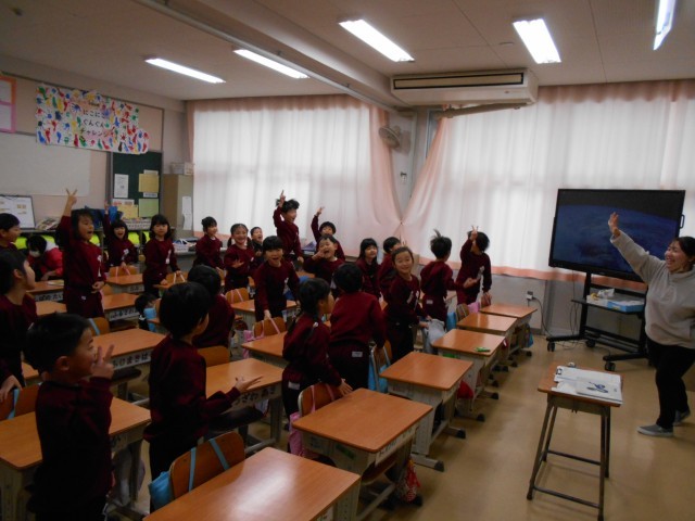12月5日、1年生・外国語活動 公開日 2025/12/05 更新日 2025/12/05 お知らせ 「Rock, Paper, Scissors, One Two Three!」の掛け声でジャンケン大会です。今日はALTの山川先生と一緒に英語に親しみました。この後、動物が登場するのですが、Dog、Rabbit、Cat・・・案外子どもたちは知っているものですね。