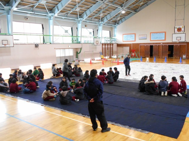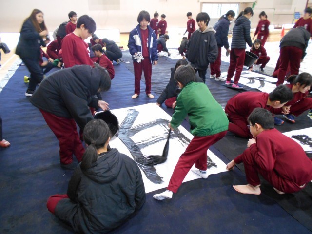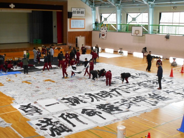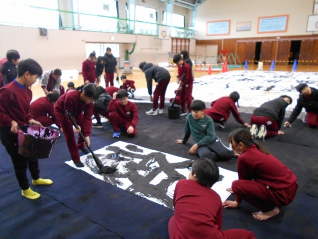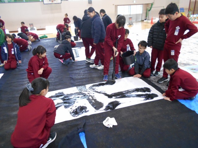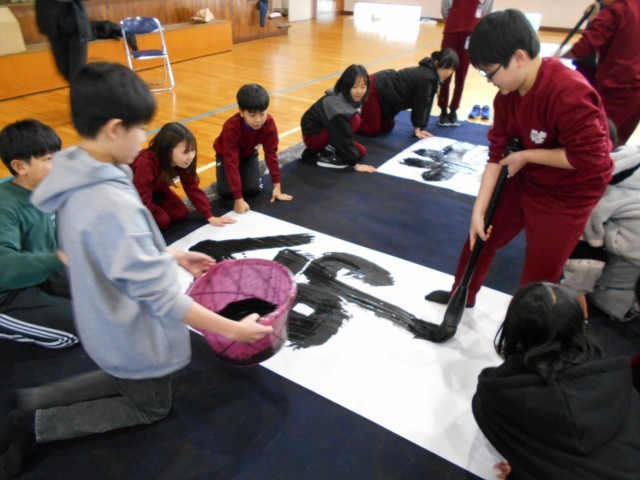 12月15日、6年生・総合「魁秀先生から学ぶ②」 公開日 2025/12/15 更新日 2025/12/15 お知らせ 書・篆(てん)刻作家の柳澤魁秀先生をお招きしての巨大書授業の2日目です。今日は、いよいよ自分で選び、決めた一文字を2m×1mの巨大半紙(?)に一発勝負で書き上げます。体育館いっぱいにブルーシートや新聞紙などを敷き、グループを作って協力して臨みます。6年生は思い思いの一文字を精一杯書き上げていました。 +5