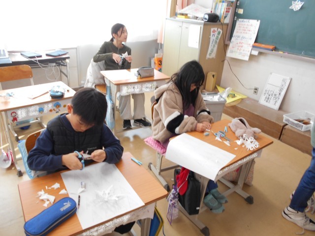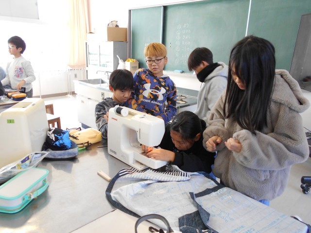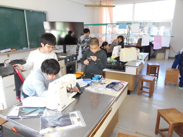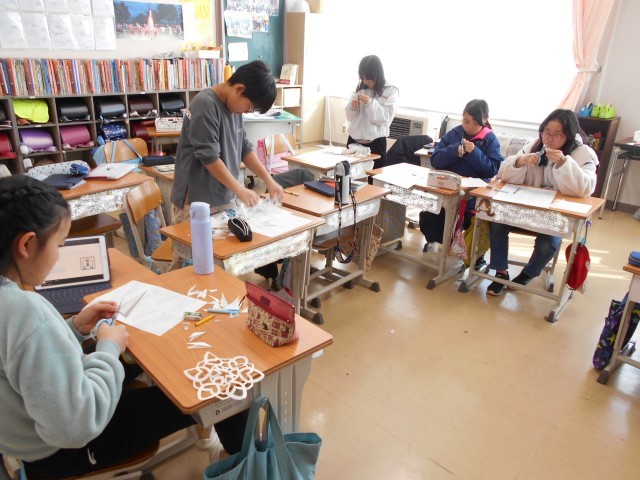 12月17日、5年生・家庭科「エプロンを作ろう」+α 公開日 2025/12/17 更新日 2025/12/17 お知らせ 5年生の初めてのミシンでの裁縫、エプロン作りもいよいよ完成間近のようです。ミシンの使い方やアイロンの使い方に慣れてきているようです。「おや?」…エプロンが完成した子どもたちは、どうやら教室でクリスマスの飾り作りのようです。紙を折って切って開くとステキな飾りの出来上がり。そういえば1年生でもやっていましたね。でも、随分細かなハサミ使いができるようになっていますね、。 +3