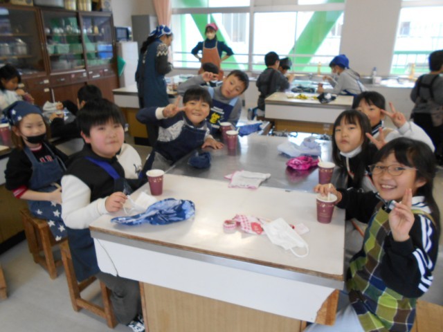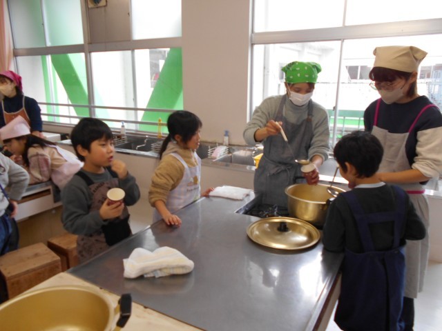 野菜作りに取り組んだ2年生は、収穫した大根を使ってスープ作りです。保護者のボランティアの協力をいただきながら、おいしく出来上がりました。ありがとうございました。スープのおかわりも盛況だったようです。寒い日にはサイコーでしたね。