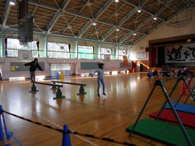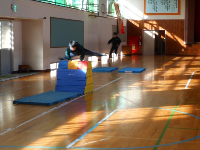 マットを回って、跳び箱を跳んで、平均台を渡り、鉄棒を回って、バスケットボールでゴールを決め、そして、次の走者に…。ゴールが一発で決まると歓声が沸き上がっていました。こてこての障害物競走を行っていたのは6年2組でした。どうやら、お楽しみ会らしいですね。この後は、しっぽ取りゲームを対戦型で楽しんでいました。