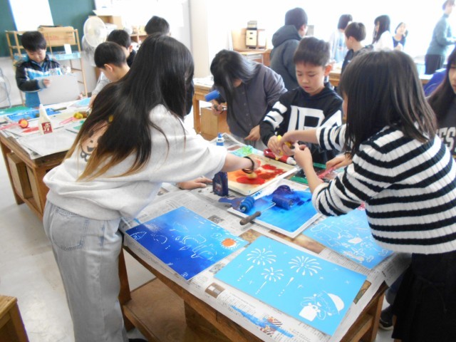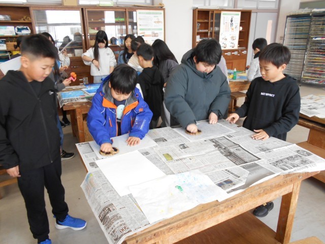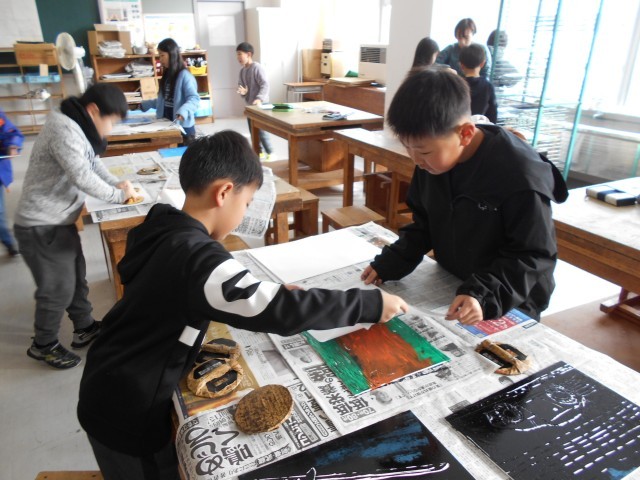 1月13日、4年1組・図工「版画」 公開日 2026/01/13 更新日 2026/01/13 お知らせ 4年生にとって、初めての木版画。彫刻刀での彫が終わり、いよいよ刷りです。黒だけでなく、カラー刷りもあり、みんな思い思いの色をイメージして版を刷っていました。4年1組の作品はうまく刷り上がったかな。