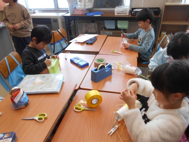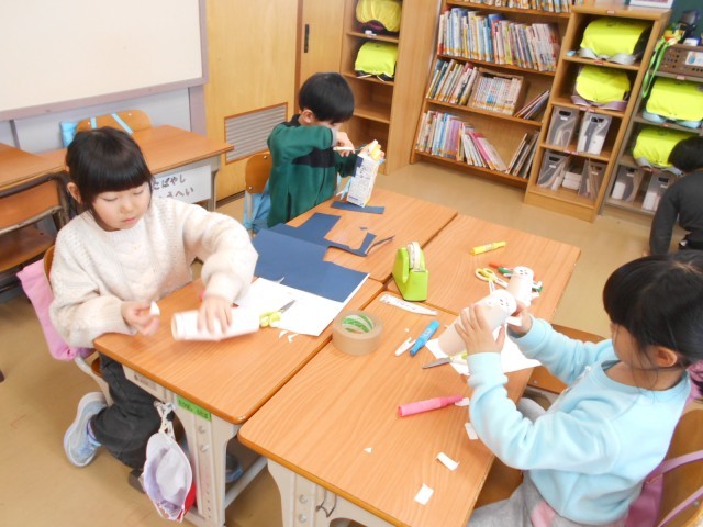 2月12日、1年生・図工「スルスルビューン」 公開日 2026/02/13 更新日 2026/02/13 お知らせ 紙コップや牛乳パック、空き箱などを利用して、ヒモをつたって楽しく滑らせて遊ぶものを作っています。ロケットっぽいものや昆虫っぽいもの、???なものなど、みんな楽しそうに作っています。ハサミを使って好きな形に切り取り、いろいろな飾りを付けられるようになりました。完成させて遊ぶのが楽しみですね。