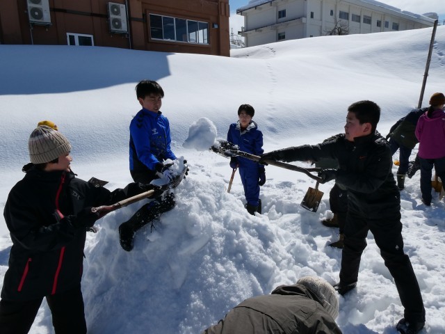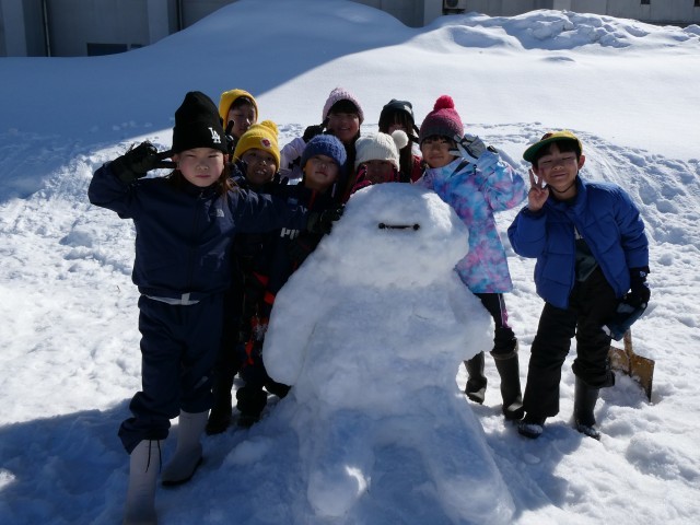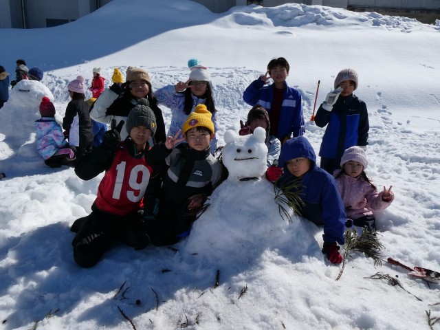 2月20日、1~5年生・なかよし班で雪像づくり