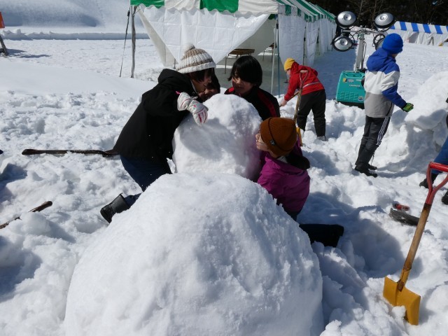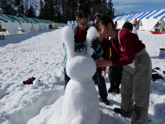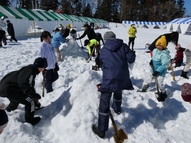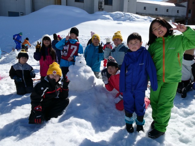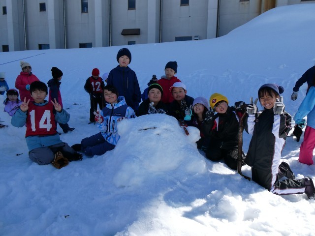 まずは、5年生が新リーダーとなってのなかよし班ごとの雪像づくりです。ウサギやアンパンマンに富士山まで…。さて、みなさんは何に見えるでしょうか。大事なのは出来栄えでなく、みんなで力を合わせて楽しみながらつくることです。うまくできたようですよ。ぜひ、会場においでいただき、ご覧ください。