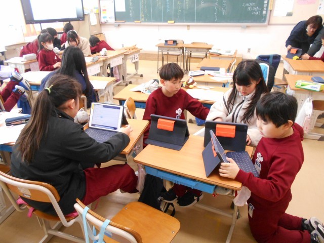3月10日、4年1組・国語「調べたことを報告しよう」 公開日 2026/03/10 更新日 2026/03/10 お知らせ 友達に聞いてみたいこと=アンケート調査をもとに、結果をまとめ、報告する学習なのですが、昔はアンケート用紙を手書きで作成していたように思いますが、今はほら。タブレット端末のアンケート機能を使って作成しています。これだと集計も一発で出てくるので早いし簡単です。学び方が変わってきたことを実感する一コマです。