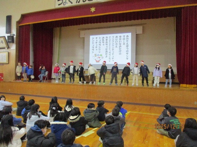 音楽朝会を行いました。1年生がクリスマスの衣装を身に付け「あわてんぼうのサンタクロース」を歌いました。振り付けも入れて楽しそうに歌ってくれました。その後2~6年生も一緒に歌いました。体育館が楽しい雰囲気に包まれました。終業式、クリスマスが間近に迫ってきました。2学期をしっかり締めくくりたいと思います。