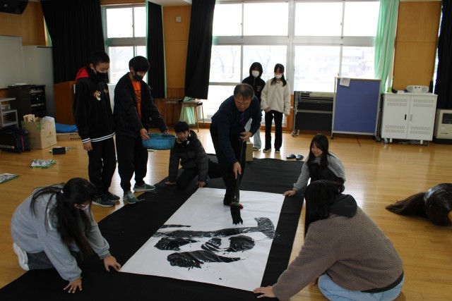 例年、卒業式に向けて6年生が巨大書作りに取り組んでいます。卒業式会場に掲示するためのものです。今年も書家の柳澤魁秀先生からご指導いただき進めます。今日はまず、書に向かうさまざまな心持ちについて柳澤先生から教えていただきました。このことを踏まえつつ、自分の思いを漢字一文字に表します。次回はいよいよ巨大書に挑戦です。「これだ!」という漢字を選び、思い切って表現してほしいと思います。