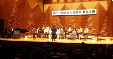 越後妻有文化ホール「段十ろう」に郡市の小学校が集まり郡市小学校音楽交歓会が行われました。上野小学校は、3年生から6年生の32名が参加しました。合唱「つばさをください」、合奏「Paredise Has No Border」を披露しました。2学期がスタートしてから、これまでたくさん練習してきました。学習発表会で披露してから、さらに磨きをかけて、みんなの音と心をひとつに合わせ、美しい音を響かせました。練習の成果を存分に発揮し、大成功でした。