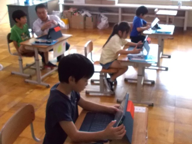 タブレット端末を使った学習、ステージでの発表練習、グラウンドでの持久走(タイム計測)、教室を飛び出してのインタビュー・取材活動等々、それぞれの学年・教室で、意欲的に取り組んでいました。