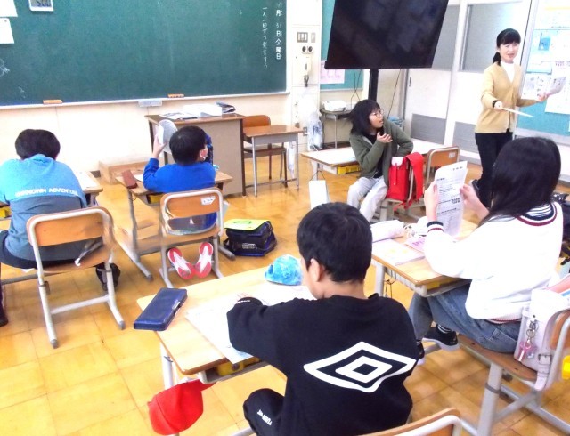 キッズ英会話、帰りの会、理科(実験)、体育(合同授業)の様子です。