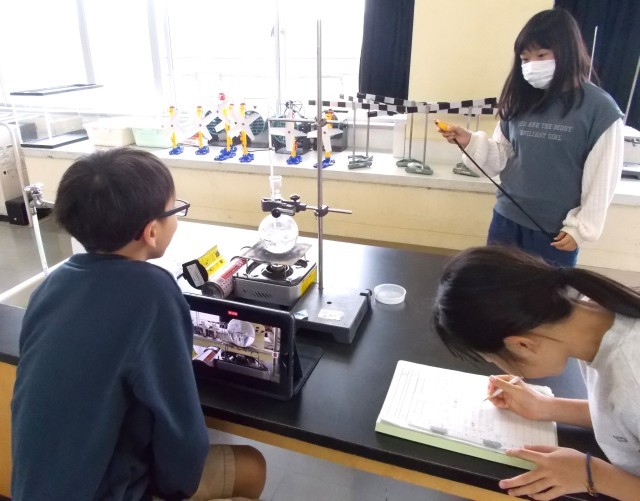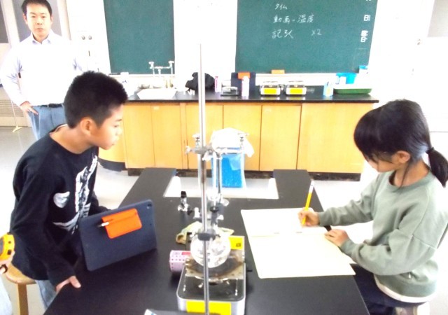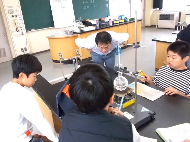 理科:4年生は、水の沸騰の様子について実験・観察中でした。役割を決めて真剣に取り組んでいました。