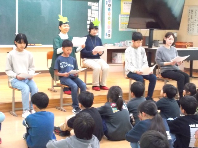 始めに、図書委員会の6年生と、ふきのとうの皆様によるコラボ朗読で、「葉っぱのフレディ」を聞きました。