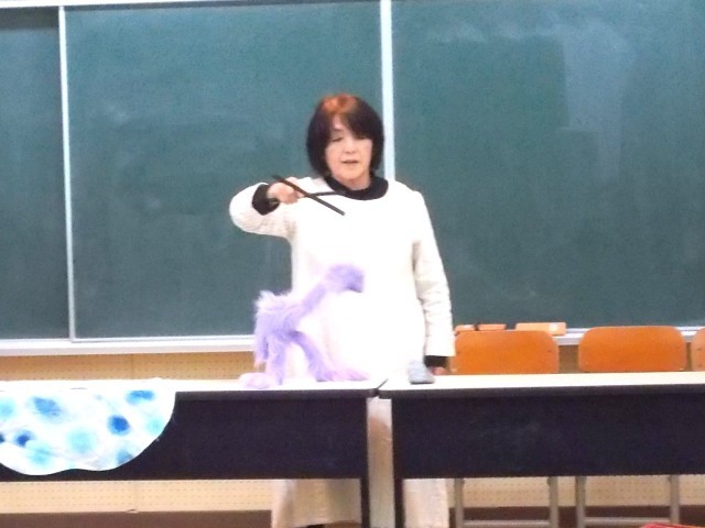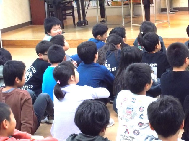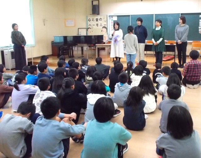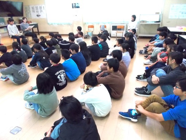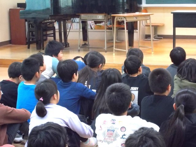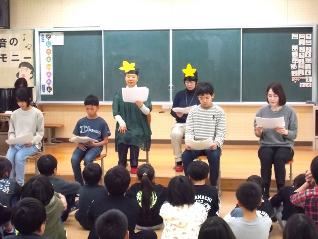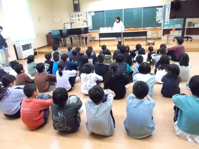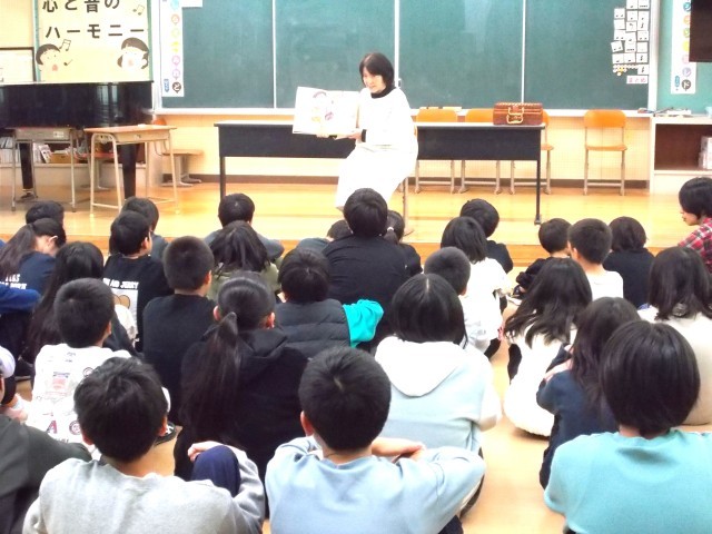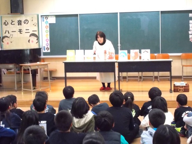 読み聞かせボランティア「ふきのとう」の皆様、江村かおる様による「お話会」が行われ、全校児童が参加しました。