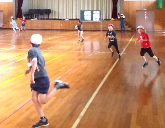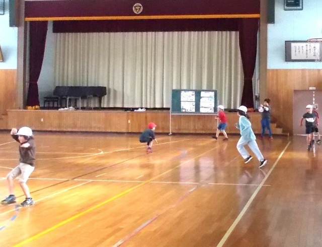 学校では、1・2年生が体育館で「お楽しみ会」を行いました。鬼ごっこの真っ最中でした。