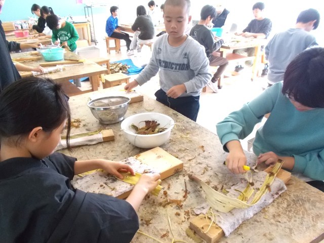 子どもたちは、教わったやり方で、早速「皮ひき」作業に挑戦しました。カッターで切れ込みを入れ、スーッと表皮を剥がします。だんだん要領を得ていく子どもたち。すごい集中力と創意・工夫で、黙々と作業を進めていました。