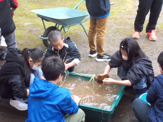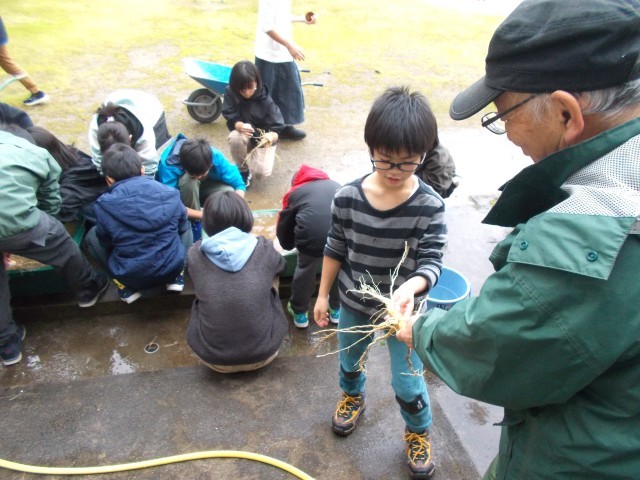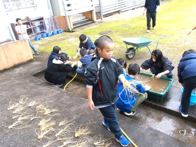 和紙を漉くときに欠かせない原料、トロロアオイを収穫し、きれいに洗い流す作業を行いました。