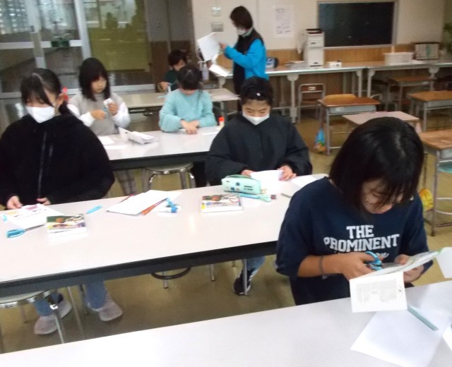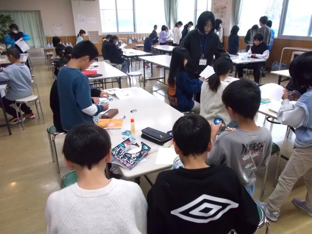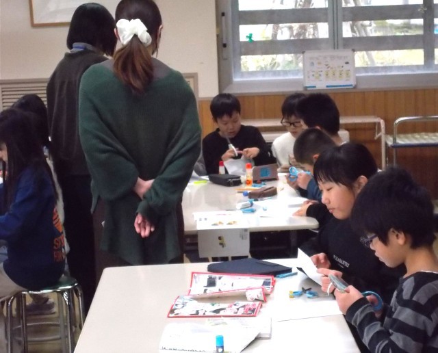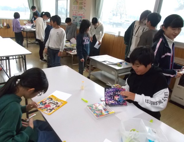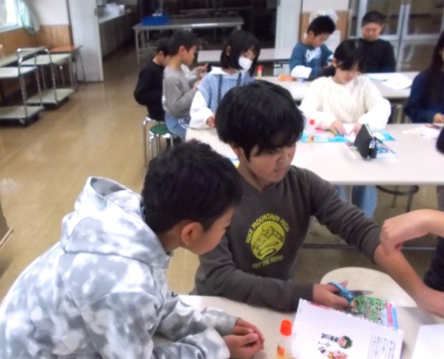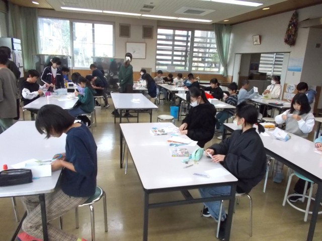 図書委員会が、昼休みに「しおりづくり」を呼び掛け、多くの子どもたちが集まりました。