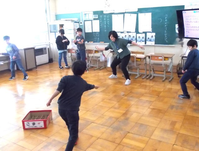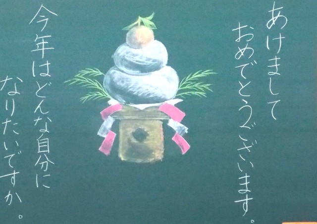 子どもたちを迎える黒板、正月遊び(コマ回し)、冬休みの思い出発表、クロカンスキー等、2026年の学習が始まりました。