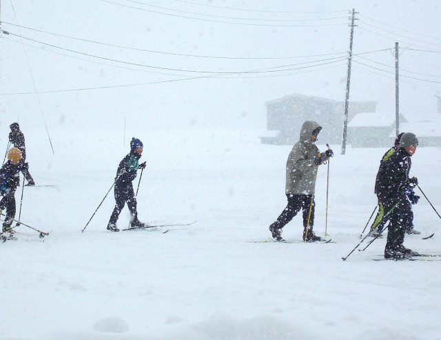 寒波の中、1~4年生はグラウンドでクロカンスキーの練習を行いました。