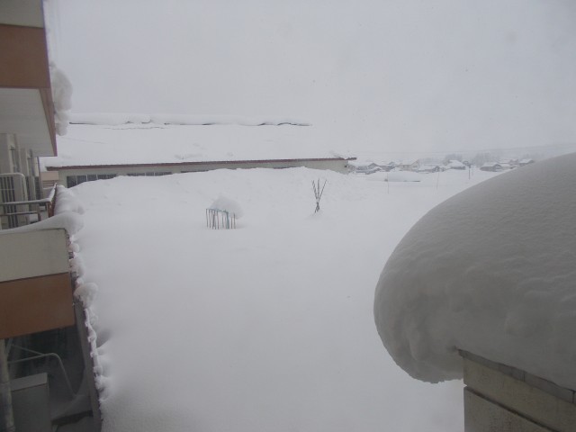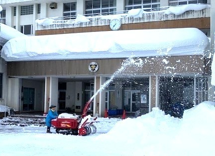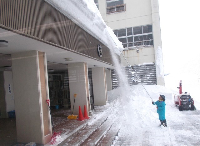 玄関前の駐車場では、今日も管理員さんが雪と格闘しています。