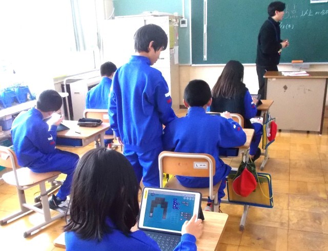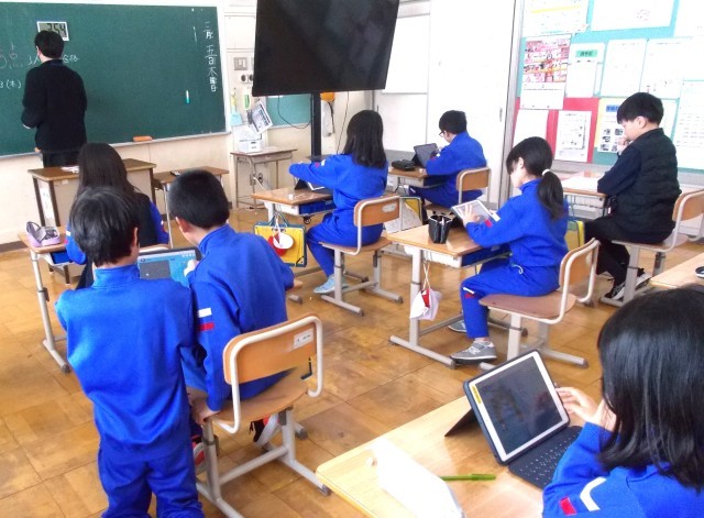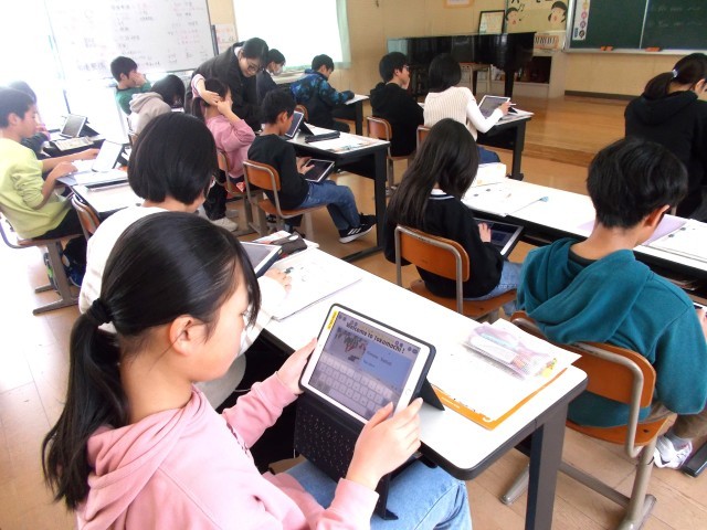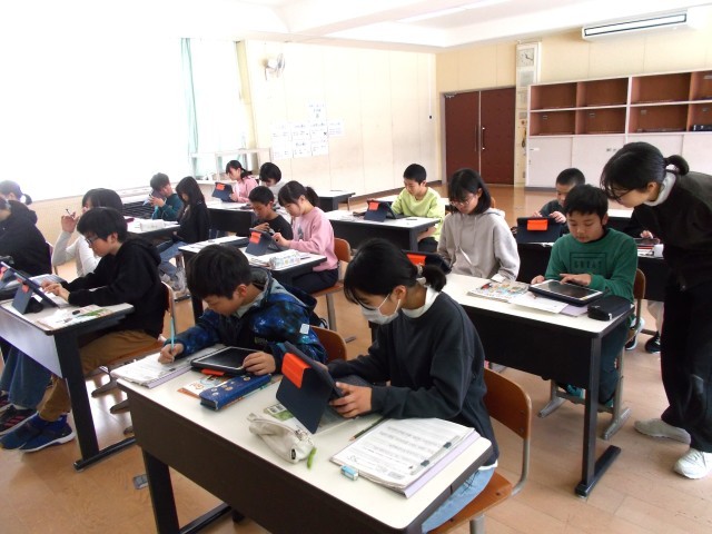 1~3年生は体育「大繩跳び」、4~6年生は教室でタブレットを使って授業をしていました。