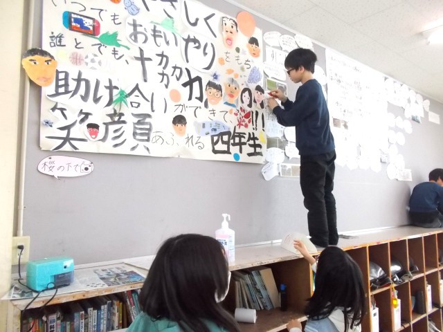教室の掲示物を外す作業をしていたのは4年生。