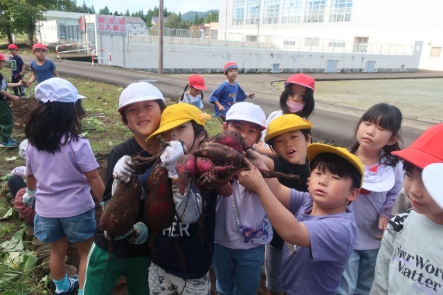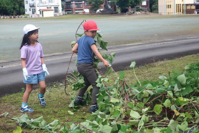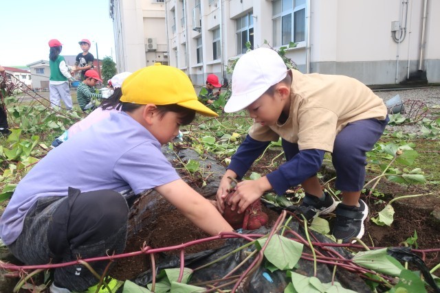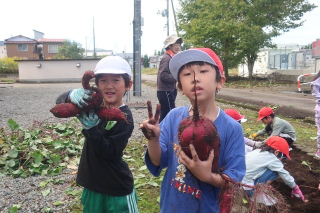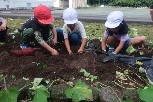 10月15日(水)、1年生はサツマイモを収穫しました。土の中で育つサツマイモ。本当にできているのかな?子どもたちは少し心配していましたが、掘り出してみると大きなサツマイモがどんどん見つかります。形もユニークで、丸々とカボチャのようなものや、反対に細長いごぼうのようなものも。どんな形でも子どもたちは大喜び。大きなサツマイモは給食の食材にして、全校のみんなに食べてもらう予定です。わーい!