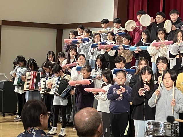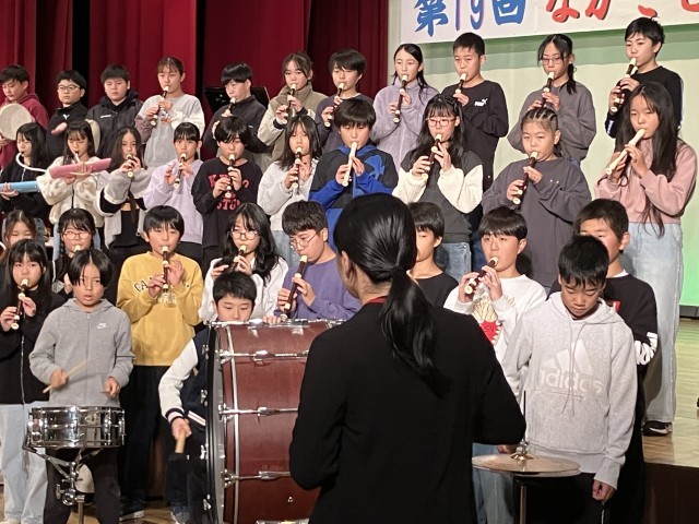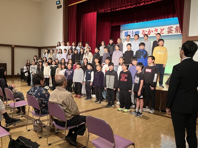 11月3日(月)、5・6年生は中里のユーモール多目的ホールを会場に行われた「第19回なかさと芸能祭」に参加しました。ステージに並んだ子どもたちは、眩しいほどのスポットライトを浴びながら、「キリマンジャロ」の演奏と「ふるさと」の合唱を披露しました。学校の発表の他にも子どもたちは歌にダンスに、芸能祭を盛り上げました。