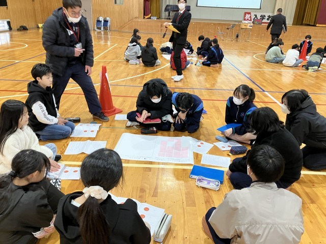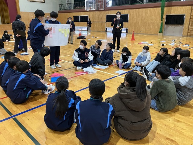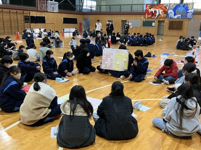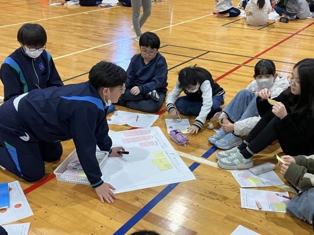 11月20日(木)、5・6年生は中里中学校を会場に行われた中学校区のいじめ見逃しゼロスクール集会に参加しました。小学生と中学生が10人程度のグループに分かれて、一緒にいじめの防止について考えました。各自が付箋に自分の考えを書いて貼っていきます。どんなことがいじめにつながるのか、どうしたらいじめをなくすことができるか。子どもたちの考えがだんだんとまとまっていきます。最後に自分たちのグループの考えを他のグループに発表しました。さすがは中学生。どのグループも話合いをうまくリードしてくれていました。