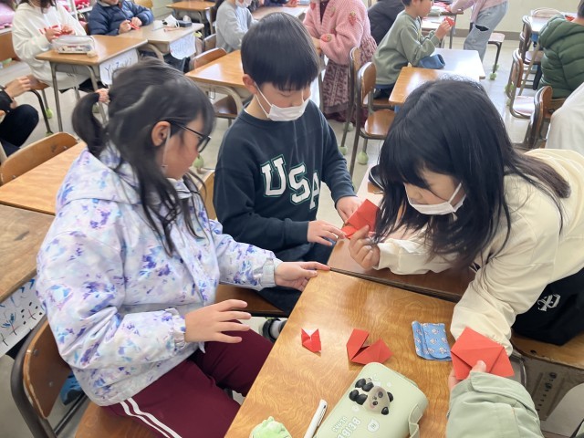 2月3日(火)、今日は今年度最後のALTによる外国語活動の日です。すべての学年が英語によるコミュニケーションを楽しみました。今回のテーマは「バレンタインデイ」。外国のバレンタインデイは日本とは少し様子が違うようです。英語の説明を聞きながら折り紙を折る3年生。メッセージを書き込んでハートの形にします。もらった人はとても喜ぶでしょうね。