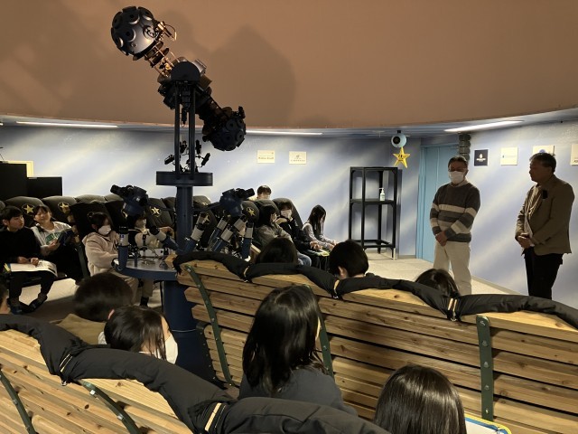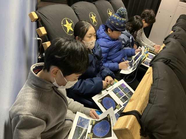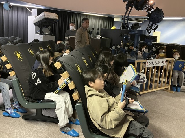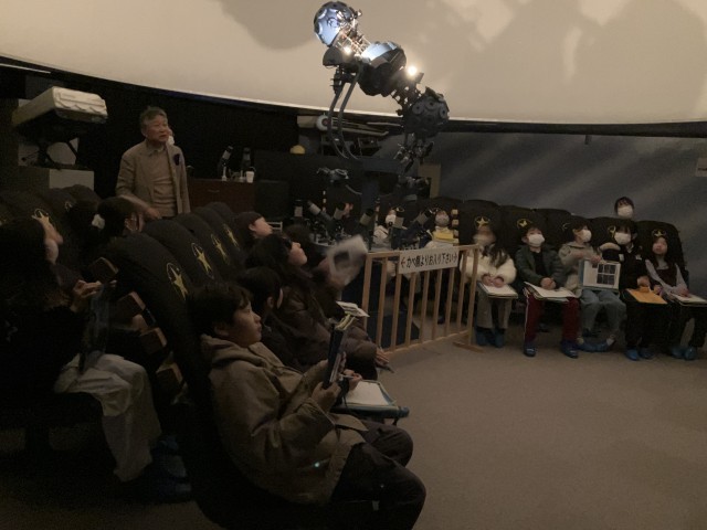 2月20日(金)、4年生は学区にあるプラネタリウムに理科の学習で出かけました。講師の方の説明を聞いた後、館内は真っ暗に。丸い天井に冬の星座が映し出されます。ゆっくりと移動する様子を見ることができました。学校から見てどの方角にどんな星座が見えるのかとても分かりやすいかったです。