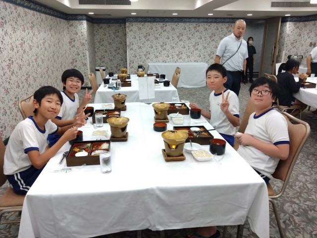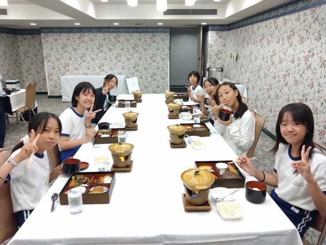 ホテルに着いて入館式を終えて各自お部屋へ。その後すぐにお風呂に入ってから、お待ちかねの夕食タイムです。少々疲れが見えていたようてすが、すっかり元気になりました。この後は、各部屋で振り返りをして、少し自由時間を過ごしてから就寝となります。