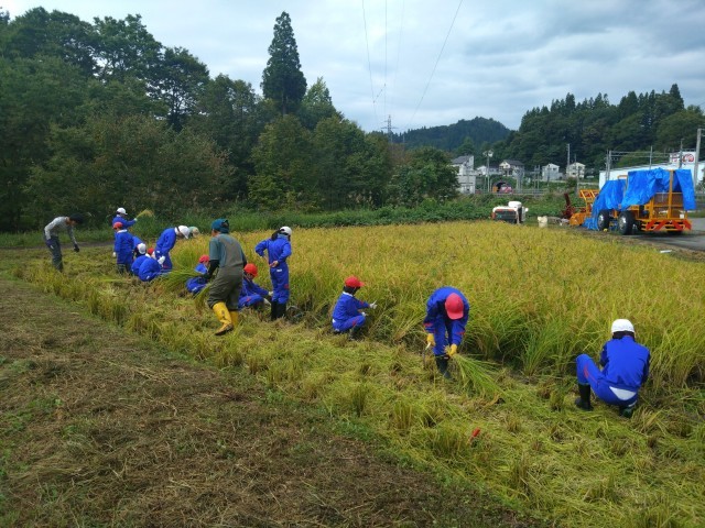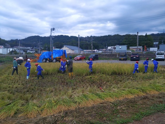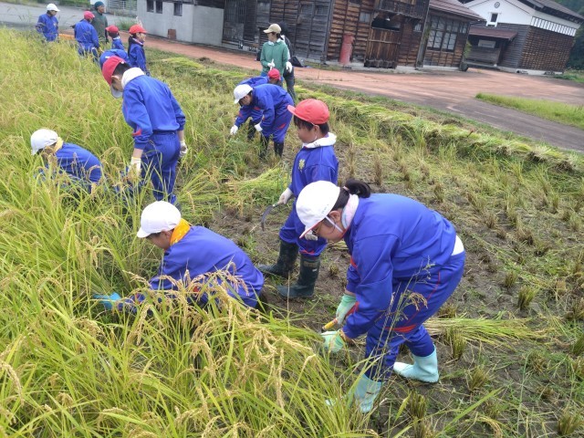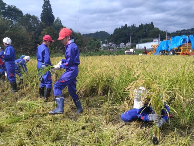 電気が心配でしたが、少し薄日が差す中、稲刈りをすることができました。初めての子どもたちもいますが、とても上手な鎌を使って順調に刈り進めています。
