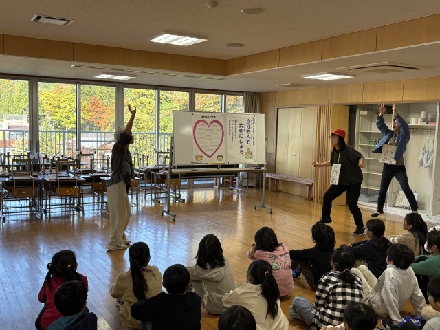 今月と来月の生活目標は、「自分も人も大切にしよう。」です。先生方が四つの場面を演じ、どうしたら良いのか全校児童で考えました。