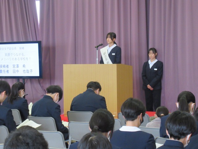 立会演説会では、各候補者が自分の思いや考えを全校生徒に堂々と発表しました。また、これまで各候補者を一番近くで支えてきた責任者も、熱い応援演説を行いました。候補者・責任者共に、その姿はとても立派でした。全校生徒も、そんな候補者の思いに応えるように真剣な態度で演説を聞き、質問者も候補者の公約に対して建設的な質問をしていました。