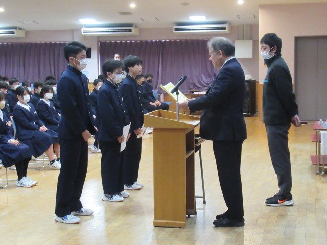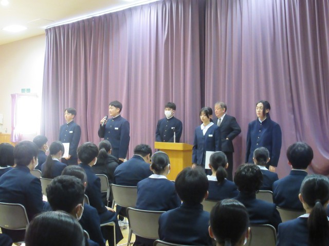 最初に先日行った令和8年度生徒会役員選挙の結果を受けて、新生徒会三役の任命式を行いました。新正副会長・応援団長は、校長先生から任命書を受け取りました。そして、4人を代表して新生徒会長の越井颯太さんが「伝統を引き継ぎ、活気あるより良い学校にしていきます」と力強く決意を述べました。