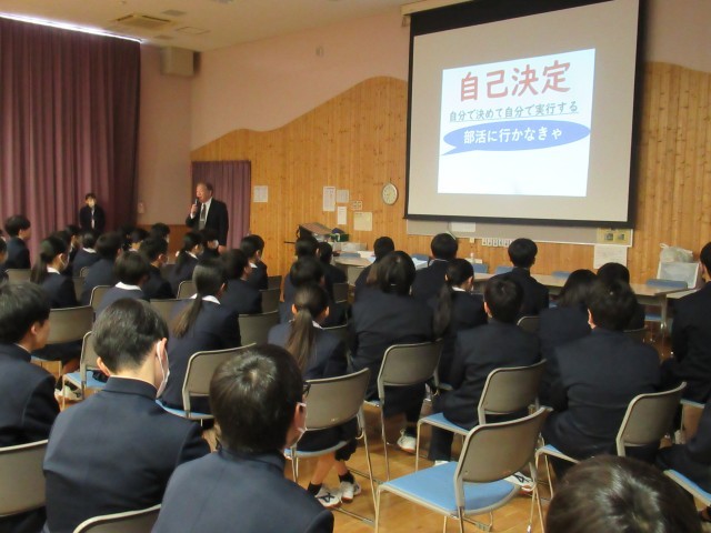 その後の全校朝会では、最初に中越地区新人卓球大会、全国中学生都道府県対抗野球大会の表彰を行いました。次に校長先生から「人間は自己決定を重ねることで幸せを感じる」という研究結果をもとに、ご講話いただきました。講話の中で「自己決定は筋トレと同じ。最初からはムキムキにならない」「『自己決定』と『わがまま』は自分で決めていても大きな違い」「自己決定するには、情報やその先のイメージが必要」とお話をいただきました。そして最後に、「小さな自己決定を積み重ねることで、自己決定の力を高めてほしい」とお話をいただきました。