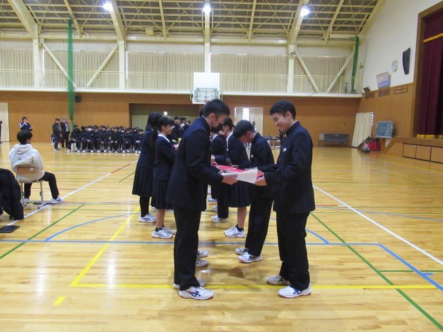 生徒会委嘱式・引継式では、新生徒会長から新本部役員・新専門委員長に委嘱状が渡されました。そして、現本部役員・現専門委員長からファイルの引継ぎが行われました。
