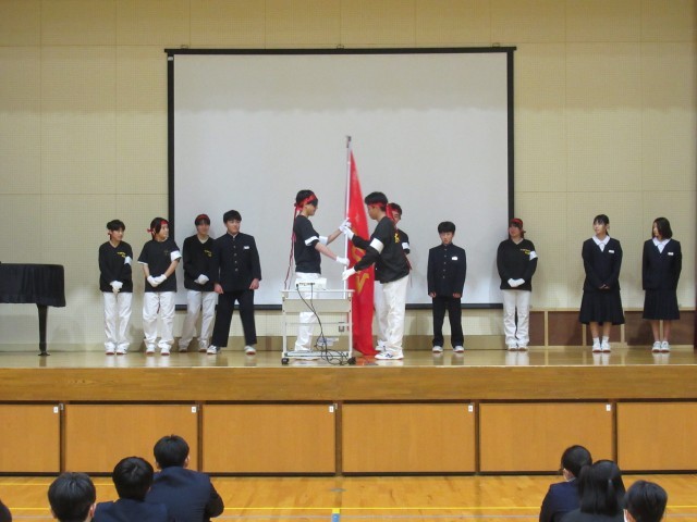応援団解団式では、前半に現正副団長と現リーダーが1年間の振り返りを発表し、その後、今年度の応援団が最後の全校での応援を行いました。後半は、新団長が決意表明を行った後、新リーダーを紹介しました。そして、現団長から新団長に団旗が引き継がれました。