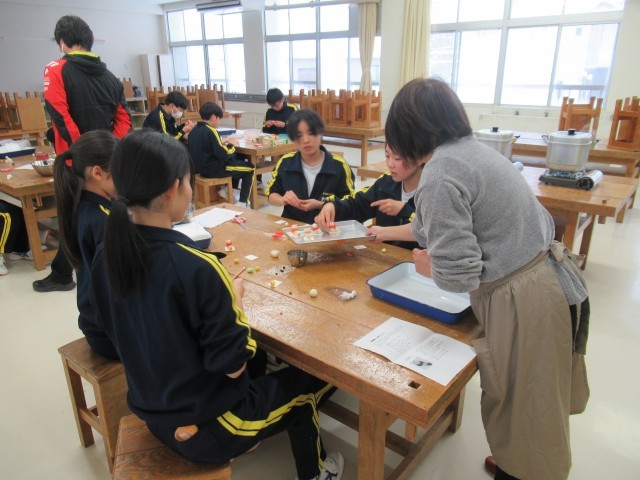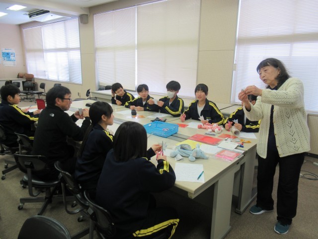 1年地域文化体験 公開日 2026/01/22 更新日 2026/01/22 お知らせ 21日(水)、1年生が5・6限の総合的な学習の時間に、「地域文化体験」を実施しました。 地域コーディネーターの徳井さんから講師の皆様を紹介していただき、「ちんころ作り」「あんぼ作り」「切り絵遊び」「縄リース作り」の4講座を開設し、それぞれに分かれて体験しました。 どの講座も、楽しそうに体験する1年生の姿が見られました。 十日町の魅力を体感できる学習となりました。 +1