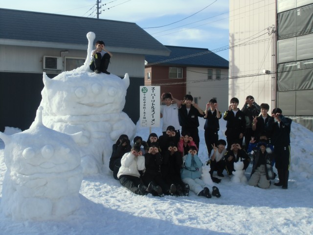 雪像づくりに向けては、冬休みの課題で1年生全員がデザインを作成し、その中から各学級で1つに絞りました。当日は各学級で力を合わせて制作し、すてきな作品を完成させることができました。是非、ご覧ください!