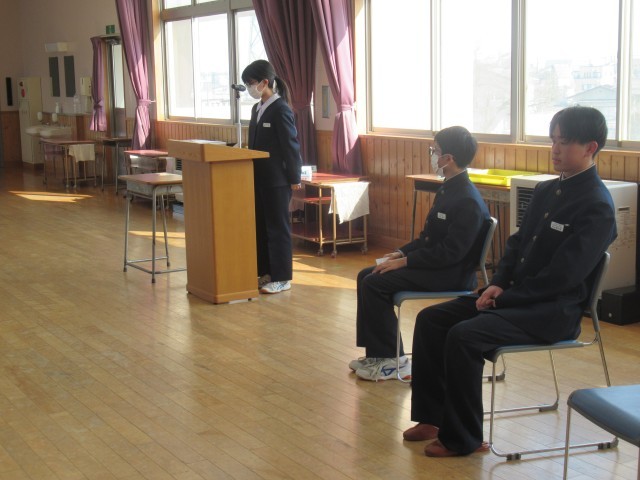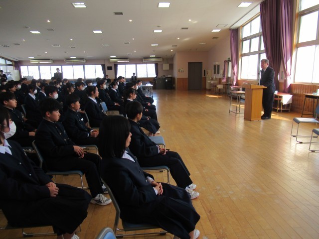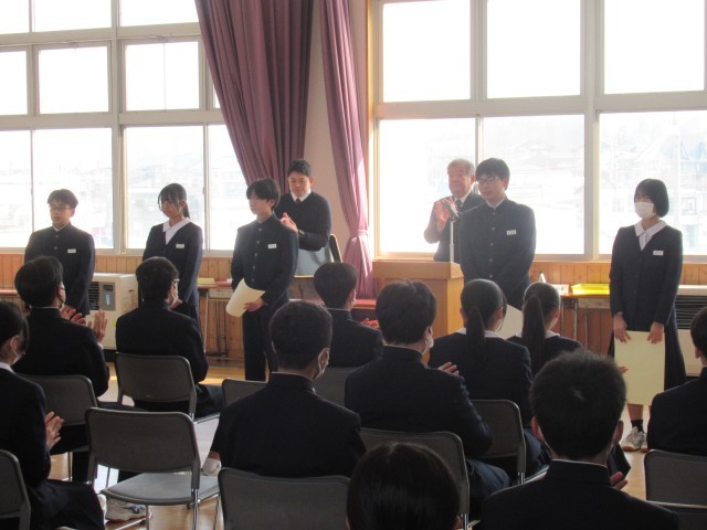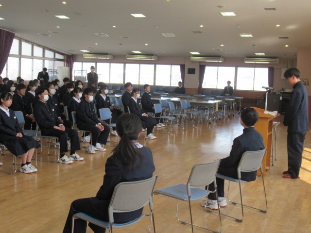 1・2年と生徒会の代表生徒が、これまで頑張ってきたことと、新年度に向けての決意を堂々と発表しました。校長先生からは、「春休みは新年度を見据え、やるべきことを具体的に決めて取り組んでほしい」「自分の心のもちようで、所作や行動が違ってくる。また、行動が自分の心をつくるとも言える。自分の心と行動をコントロールできるようになってほしい」と新年度に向けてのお話をいただきました。