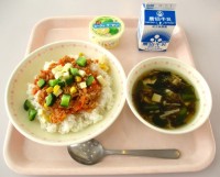 今日の給食は、・ひじきそぼろ丼・カリカリ漬け・ほうとう汁・牛乳 です。