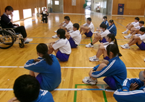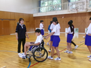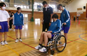 介護の仕事内容をお話しいただき、実際にサポートの仕方や車いすを体験しました。